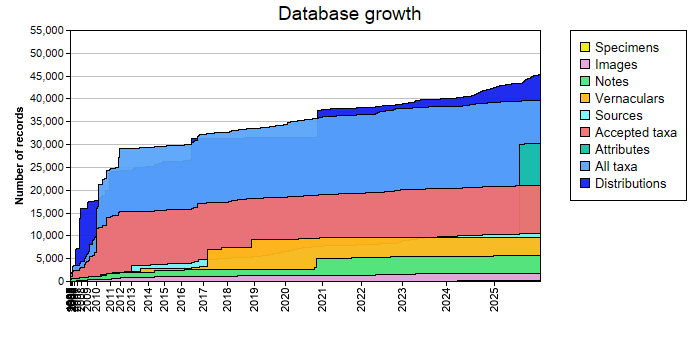 - all names: number of scientific names at all ranks (sum of species, genera, families,..., accepted and synonyms)